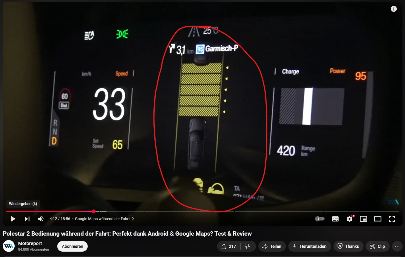 Diese dritte Anzeige im Fahrerdisplay gab es sowohl bei Polestar, als auch bei Volvo nur ganz zu Beginn von AAOS. Den eingestellten Abstand sieht man aktuell nur, wenn er verstellt wird, was nicht wirklich störend ist, aber verkehrt wäre eine permanente Anzeige des eingestellten Abstand nicht.