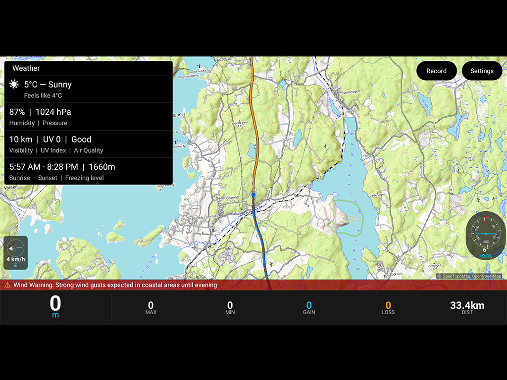 • Sprachbasierte Wetteralarme — die App warnt über die Autolautsprecher bei Eisrisiko, Schneefallgrenze in der Nähe, starkem Wind oder Gewitter