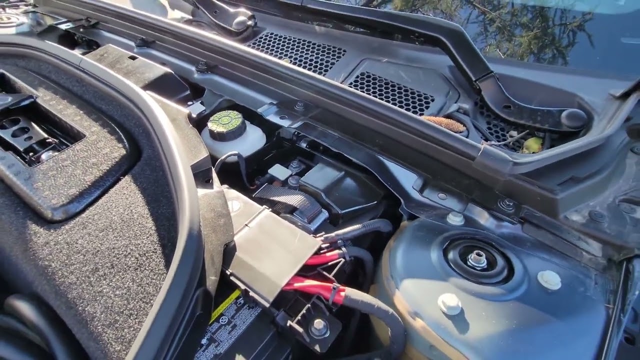 Du musst die schwarze Abdeckung entfernen, die näher an der Windschutzscheibe ist. Dazu die Pins rechts und links öffnen (einmal in der Mitte reindrücken). Anschließend liegt der Minuspol der Batterie frei.