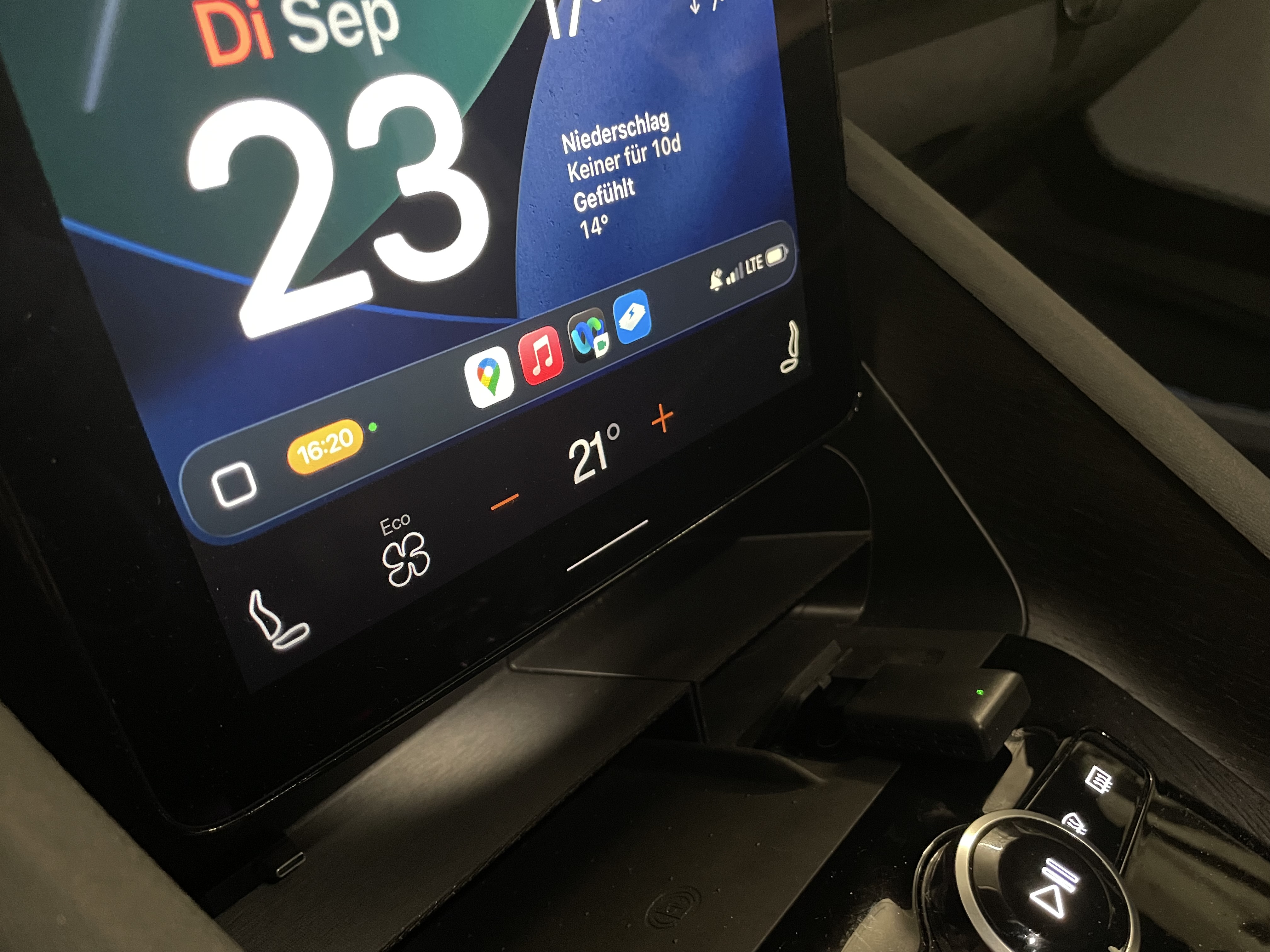 Sehr kurzes Kabel zum Laden, induktiv grillt das Handy mehr als es lädt, daher bei mir immer aus. Für die CarPlay-Funktion ein kabelloser Adapter und gut ist die Laube. Alle Funktionen ansteuerbar, kleines Manko, Tür auf und aussteigen nur mit Handy in der Hand, ansonsten kann der Verbindungsaufbau beim Wiedereinstieg happern. Fahrerdisplay mit Maps geht bei mir weder mit noch ohne Kabel, aber ich habe Google. Reicht mir völlig. Ansonsten ist die Karte auf dem Center-Display groß genug. Ohne Stick - Danke nein. Jedes Mal das Anschließen des Handys und gleichzeitiges Laden war mir zu doof.