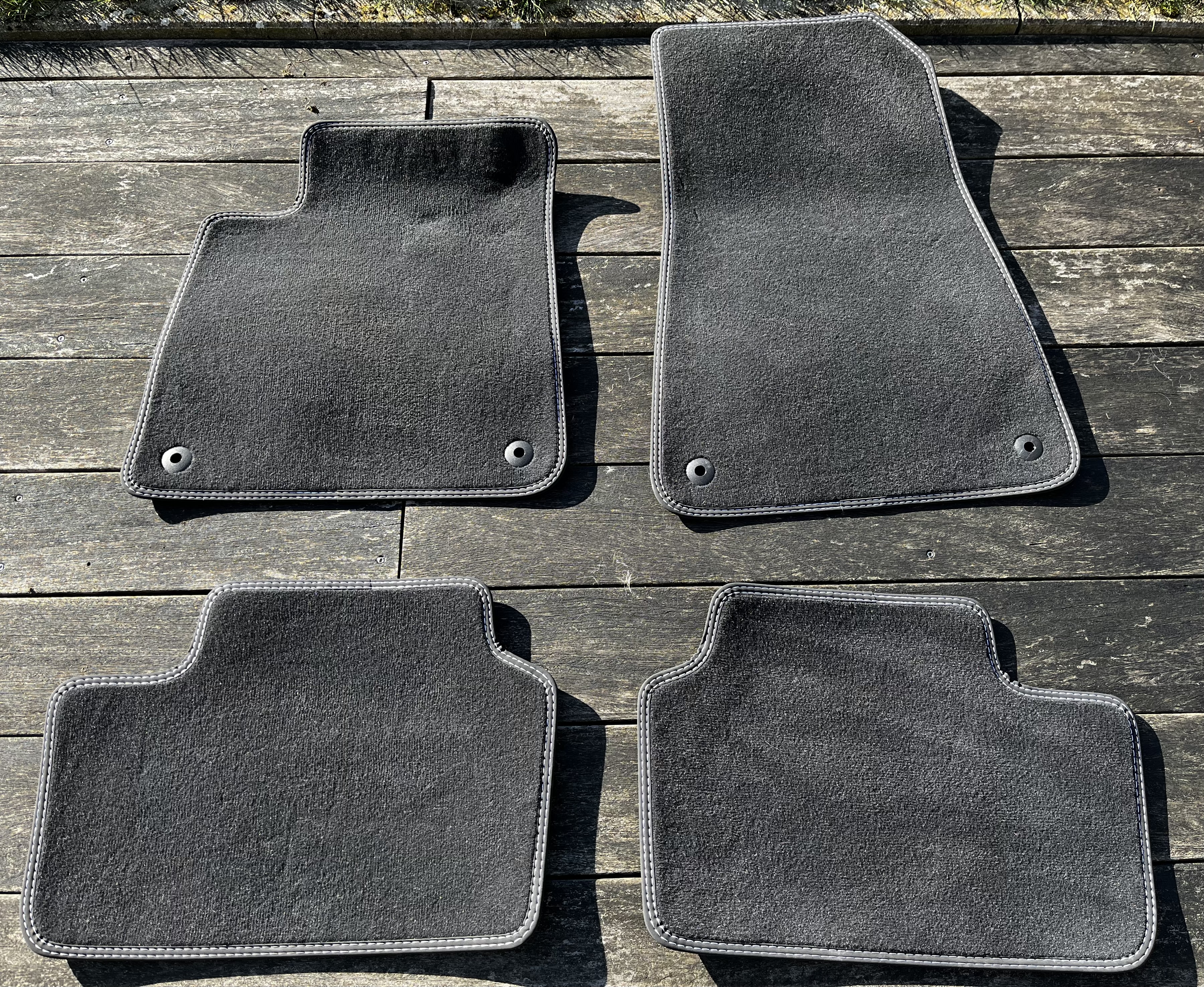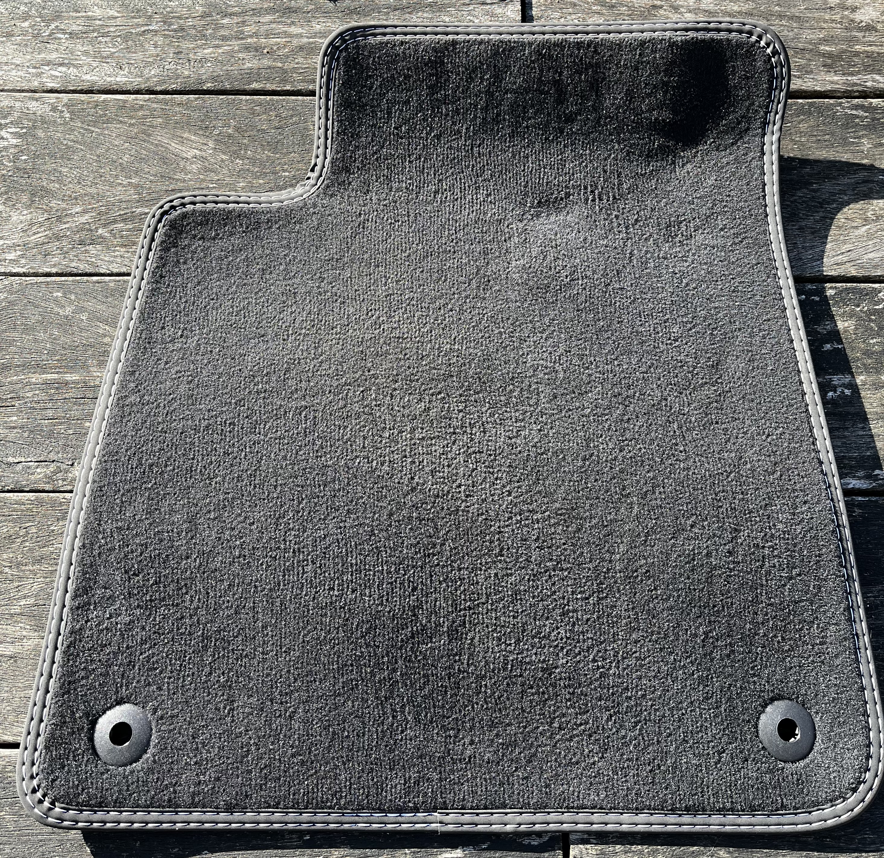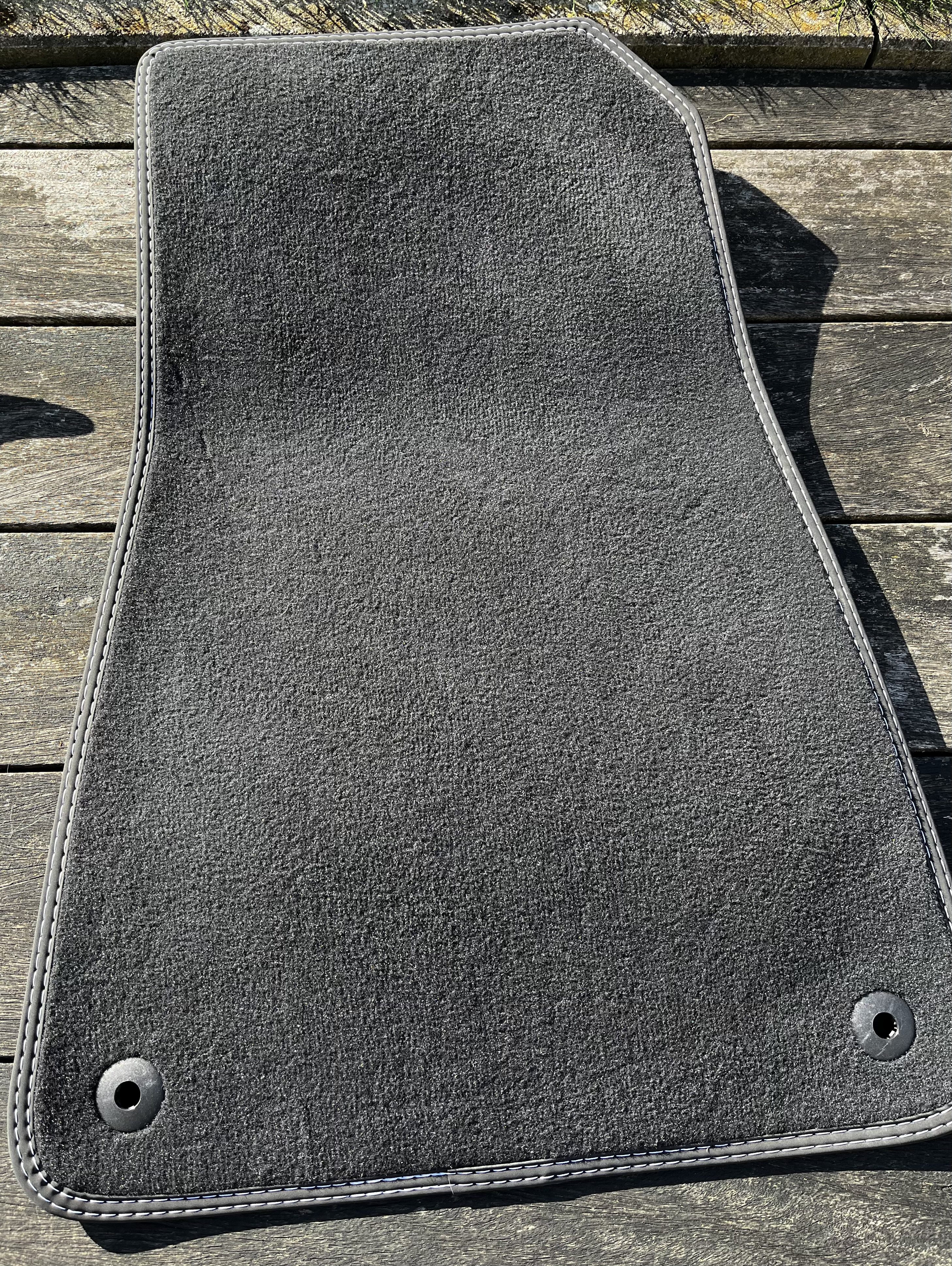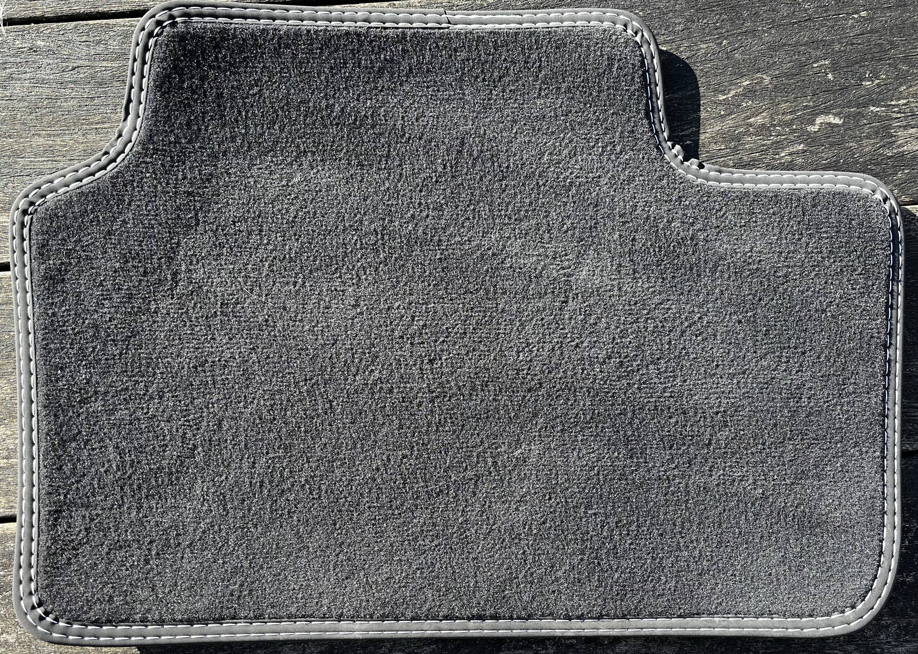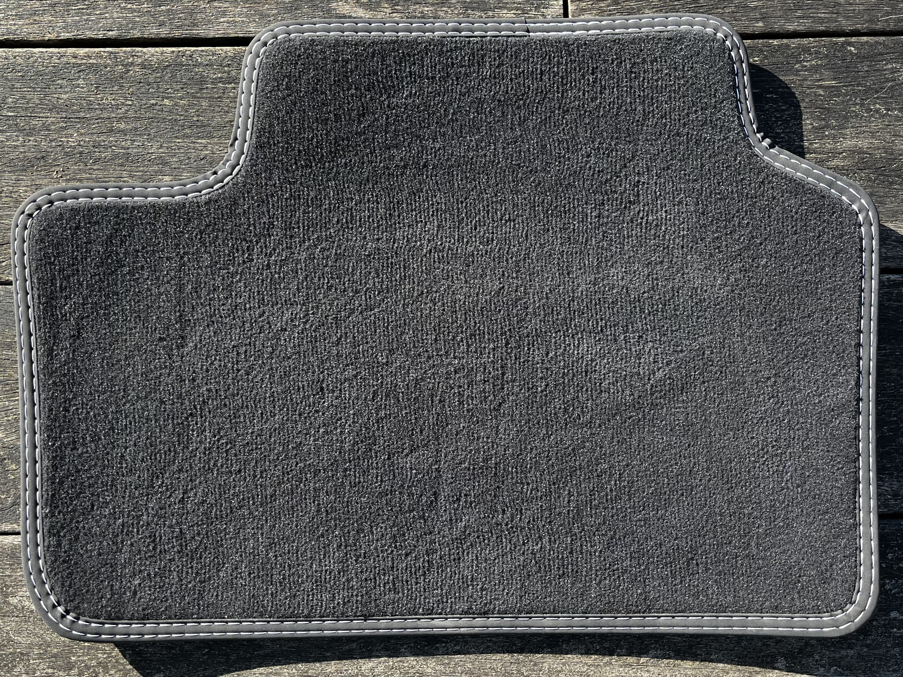 Deluxe-Velours-Fußmatten anthrazit mit Nubukband und weißer Doppelnaht.