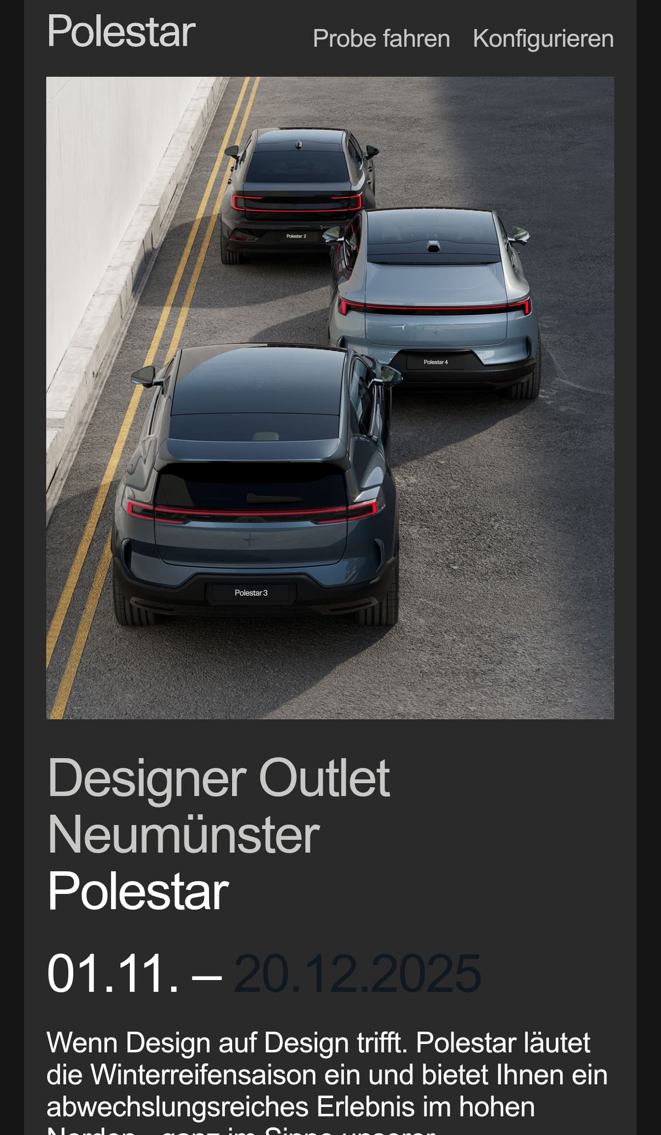 Wenn Design auf Design trifft. Polestar läutet die Winterreifensaison ein und bietet Ihnen ein abwechslungsreiches Erlebnis im hohen Norden - ganz im Sinne unserer skandinavischen Herkunft. Testen Sie die neuesten Polestar Modelle und runden Sie den Tag mit einem exklusiven Shoppingerlebnis im Designer Outlet Neumünster ab. Wir sind montags bis samstags von 10 bis 20 Uhr im angegebenen Zeitraum für Sie da und beantworten Fragen rund um unsere Marke und Produkte. Freuen Sie sich zudem auf eine Probefahrt mit der stilvollen Limousine Polestar 2, dem leistungsstarken vollelektrischen SUV Polestar 3 oder dem eleganten SUV-Coupé Polestar 4. Spüren Sie die beeindruckende Kraft, das innovative Design und das einzigartige Fahrgefühl auf Ihrer persönlichen Probefahrt.