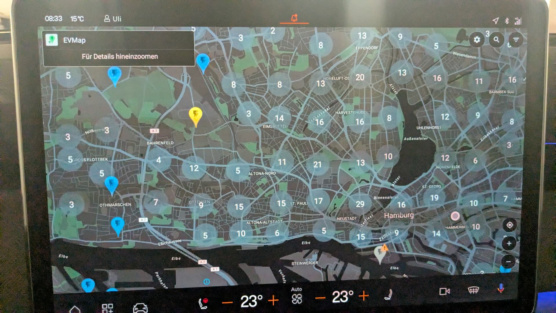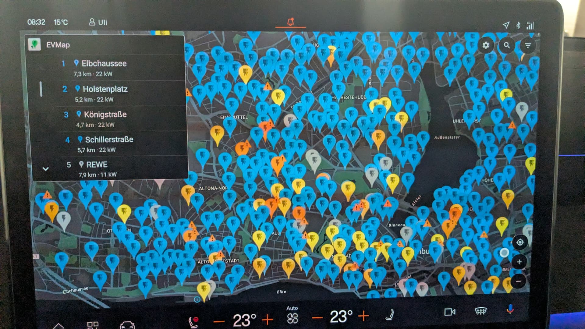 In einem dicht mit Ladesäulen ausgestatteten Gebiet wie die Hamburger City und andere Städte wird sich die Liste wahrscheinlich bei Bewegung des Fahrzeuges schnell ändern. Wobei man dann ja wahrscheinlich in der Liste gar nicht scrollen soll …
