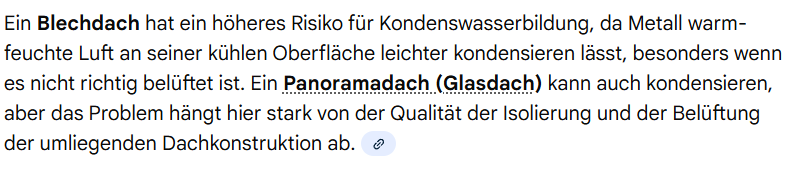 Aber rein physikalisch erzeugt ein Glasdach einfach mehr Kondenswasser als Blech mit Isolation.