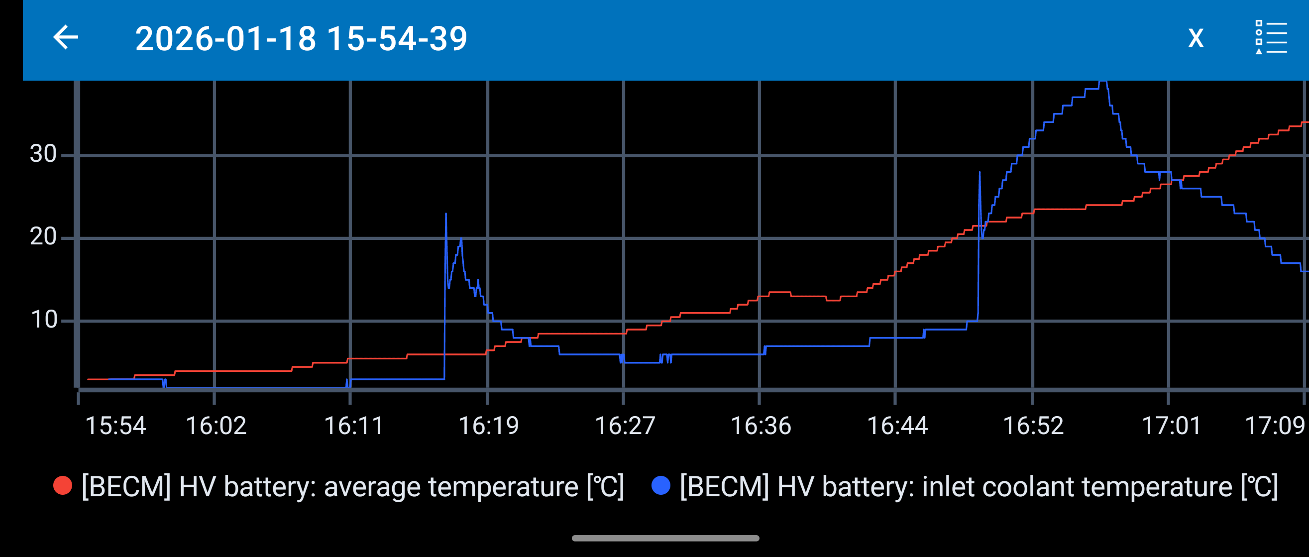 Hi Johannes, Deine Logik ist nachvollziehbar und so dachte ich es auch, aber fällt Euch nicht auf daß die Kurven des Batterie-Temperatur und des „Coolant“ merkwürdig entkoppelt sind, da lässt sich nur mit unendlicher Fantasie ein minimaler Zusammenhang erkennen