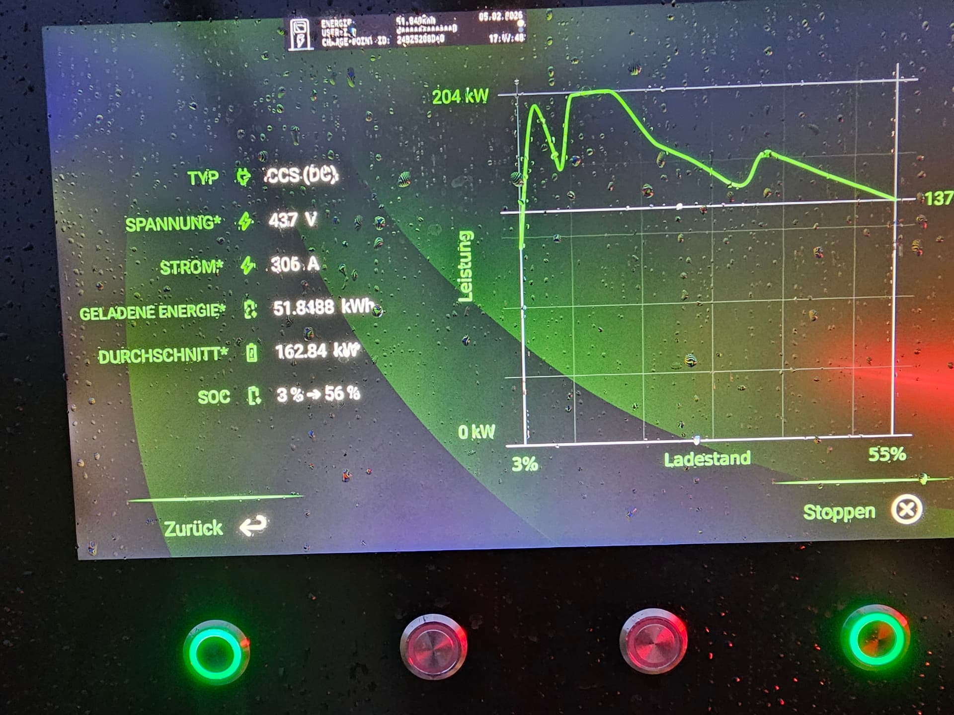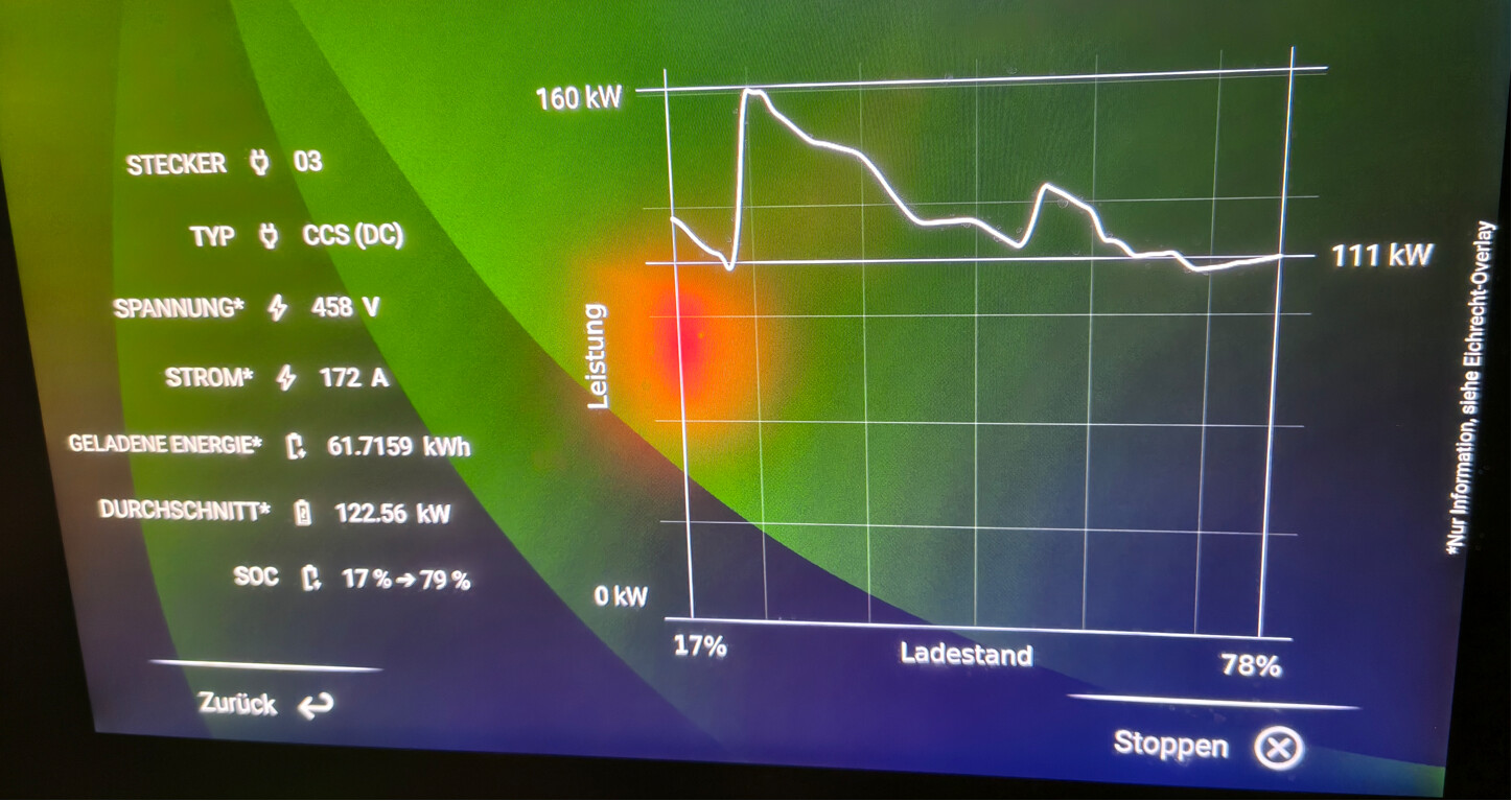 Zu Beginn fehlt der Peak. Einstieg bei 119kw. Bei höherer Batt.temp. dann kurz auf 160kw, mehr war nicht drin.