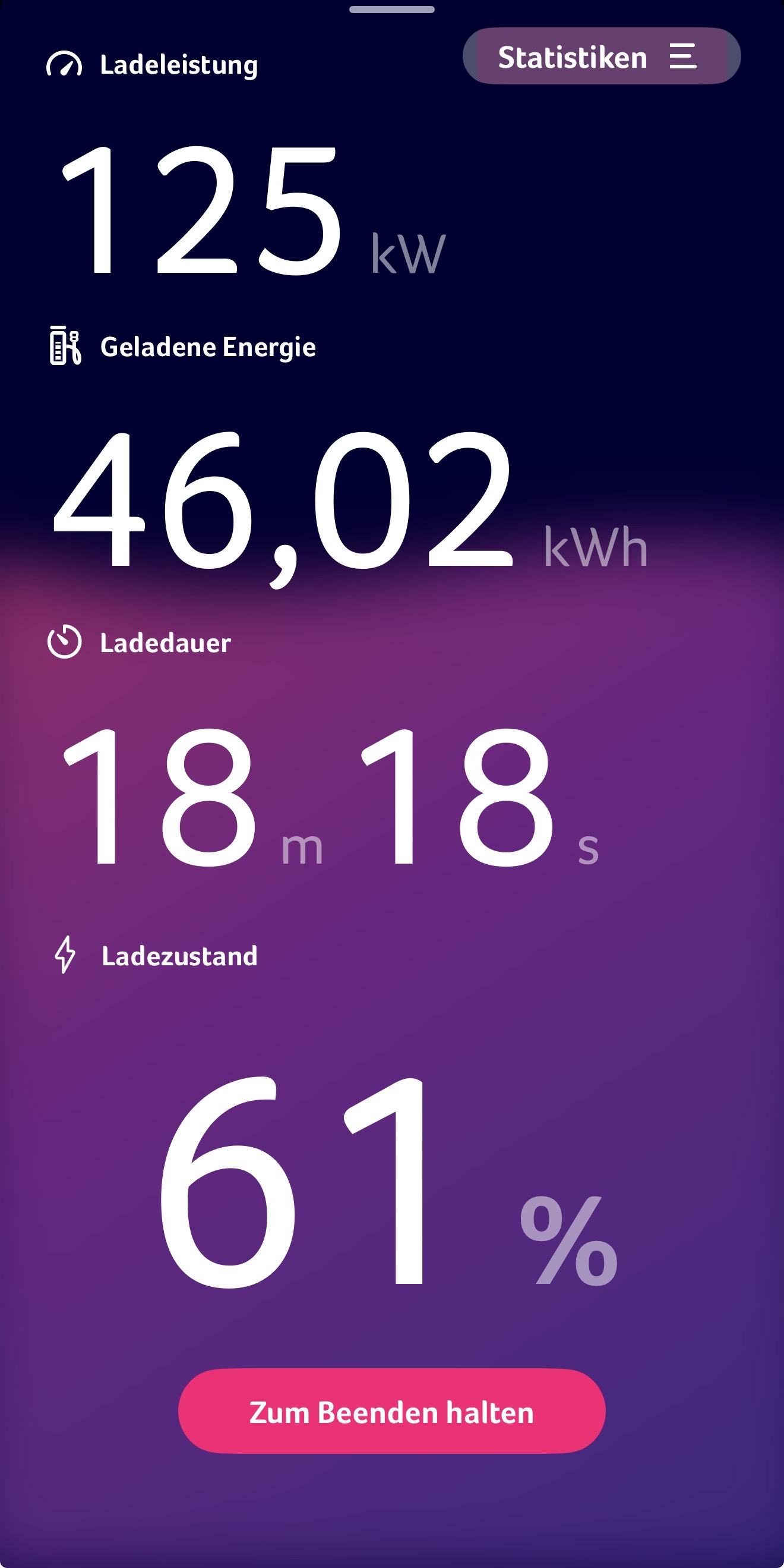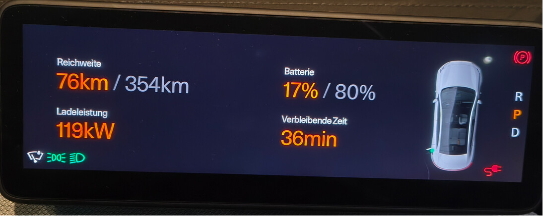Ich fahre sonst keine Langstrecke und lade zu 90% zuhause an der Wallbox. Heute musste ich an einen Schnelllader. Wegstrecke waren 240 km, Fahrzeit 2 Stunden 15 Minuten. Habe selbstverständlich den Schnelllader als Ziel eingegeben.