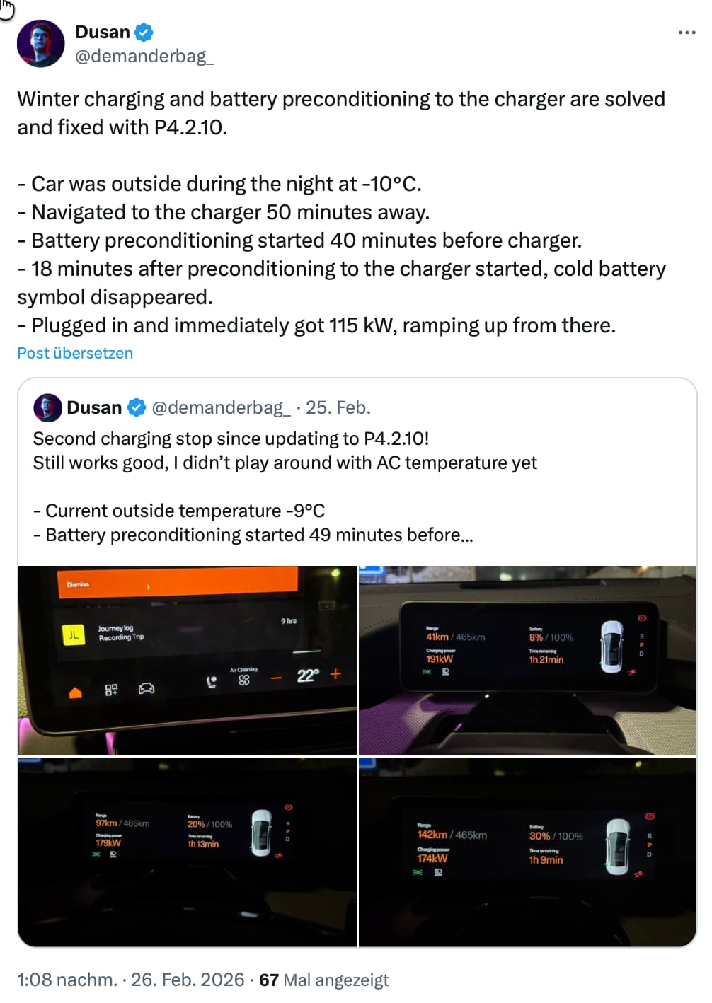 Letzter ist ganz interessant, da hier ähnliche Beiträge gepostet werden in Bezug auf unterschiedliche Ladeerfahrungen bei gleichem SW-Stand. Und natürlich reitet dort auch regelmäßig jemand vorbei und weist auf die Ladeinfrastruktur und Fehler der Fahrer (Stichwort Vorkonditionierung) hin.