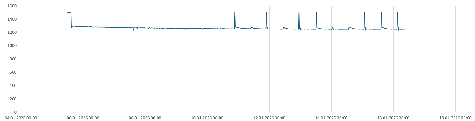 Anzumerken ist, dass ich nur alle 20min einen Messwert übertrage. Da die Ladezyklen recht kurz sind (wenige Minuten), ist nicht jeder im Diagramm mit voller Spannung erkennbar.