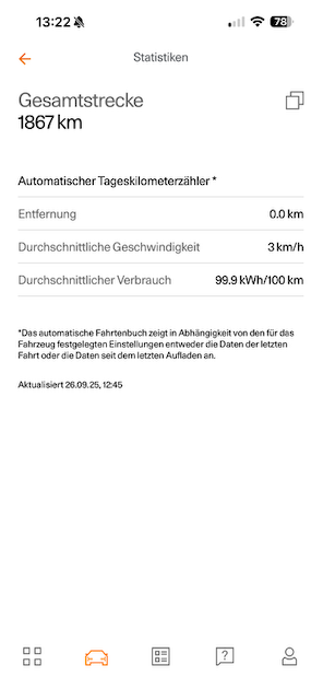 Den Durchschnittswert meiner bisherigen Fahrten habe ich mir tatsächlich noch nicht angesehen, da es überwiegend Kurzstrecke war. In der Handyapp sehe ich hier aktuell folgendes, was ja hoffentlich Kokolores ist: