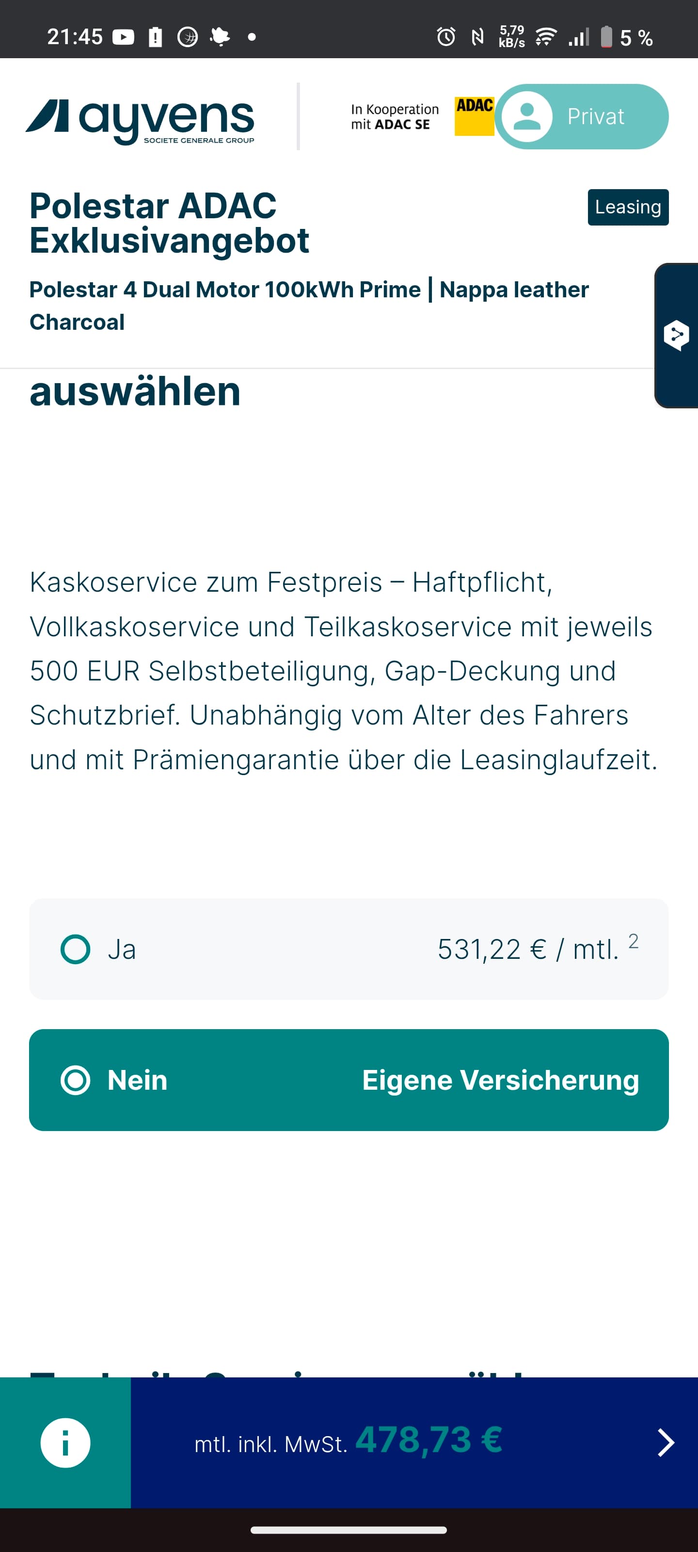 Allerdings sind die an eine ADAC Mitgliedschaft gekoppelten Leasingangebote besser w/ angeblichen 0% Zinsen. Bei Interesse mal bei ALD schauen, Polestar ist da bei der Konfiguration flexibel.