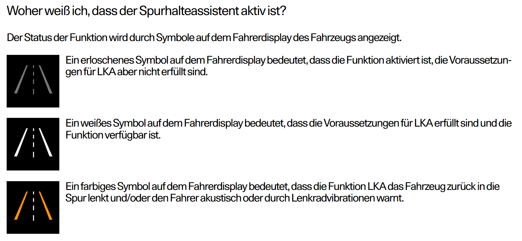 - und eine optische Anzeige im Kombiinstrument oder Display vorhanden sein muss (oft ein Lenkrad- oder Fahrspur-Symbol).
