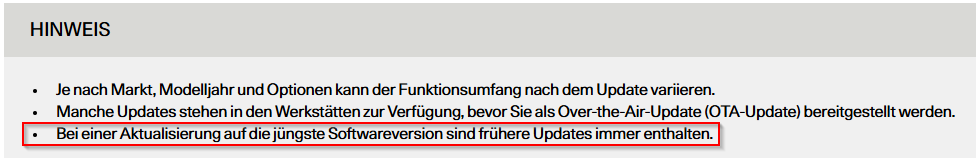In der Auflistung der verfügbaren Software-Versionen wird eigentlich nie formuliert, ob OTA oder nur in Werkstätten verfügbar. Das erfahren wir dann meistens nur aus den Foren.