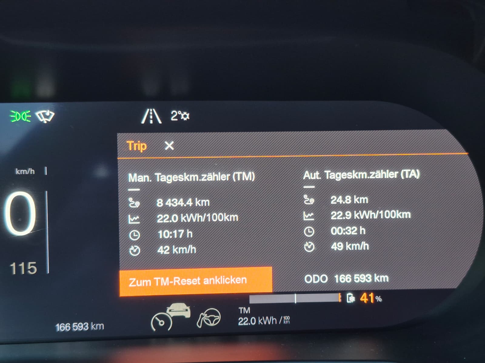 Dabei hat das Display 19,5 kWh pro 100 Kilometer angezeigt (war beim Start zurück gesetzt).