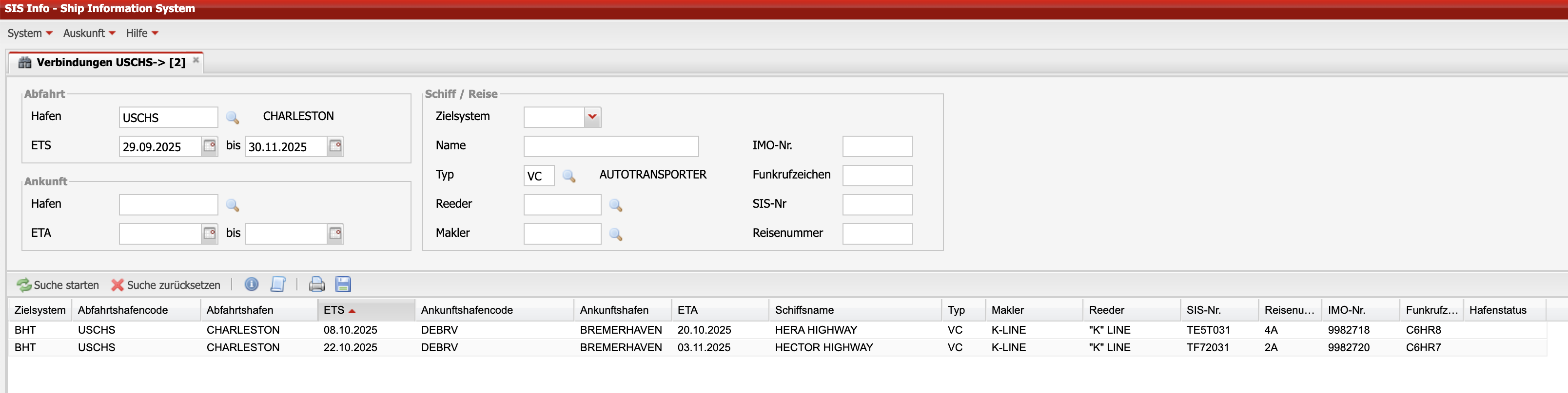 Tracking: Ich habe außerdem auf SIS-Webauskunft geschaut. Für den Zeitraum 29.09.–30.11. sind dort aktuell zwei Vehicle Carrier (VC) eingeplant (siehe Bild).