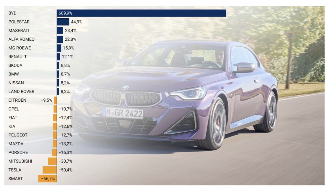 Zweiter Platz nach BYD in Deutschland, wobei BYD laut Online-Artikel 75% Eigenzulassungen hatte, also sehr viel weniger echte (Kunden-)Zulassungen.