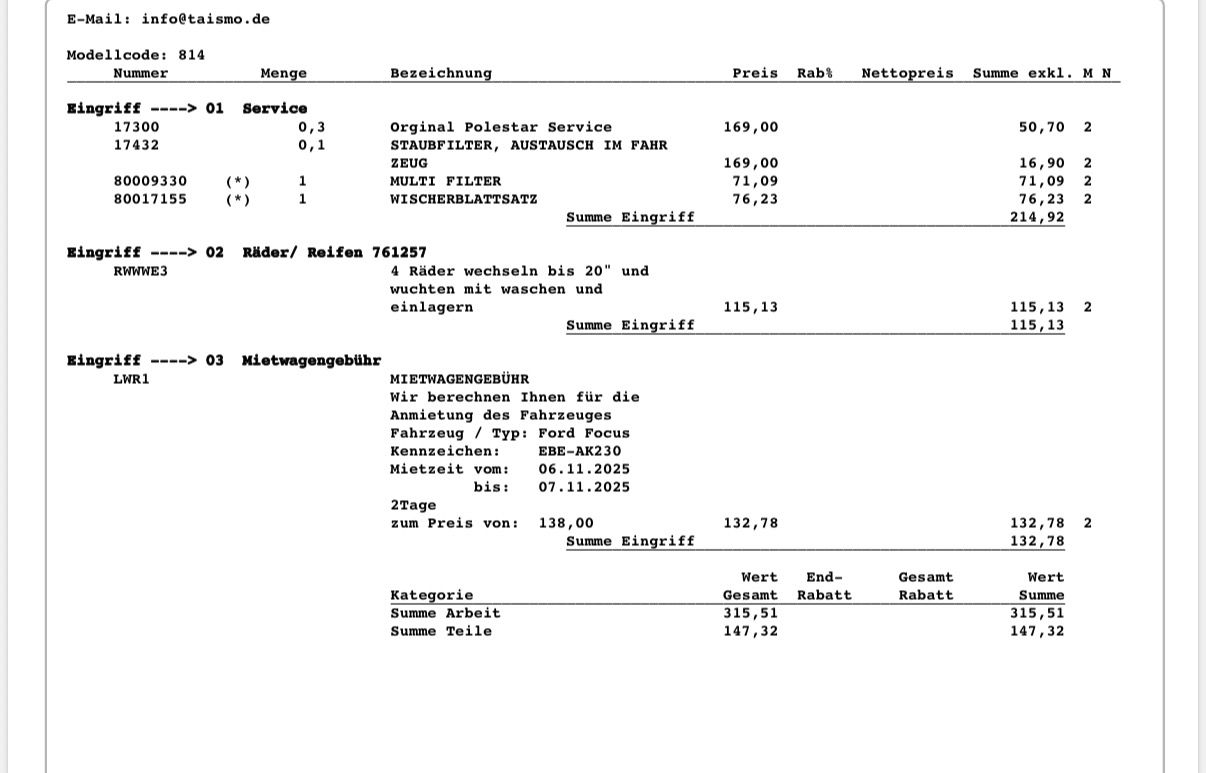 Wenn ich mir die Rechnung so ansehe, sind das für den „eigentlichen Service“, exklusive der anscheinend bei Polestar immer sehr teuren Wischerblätter, aber nur 140€, das find ich absolut fair, oder nicht?