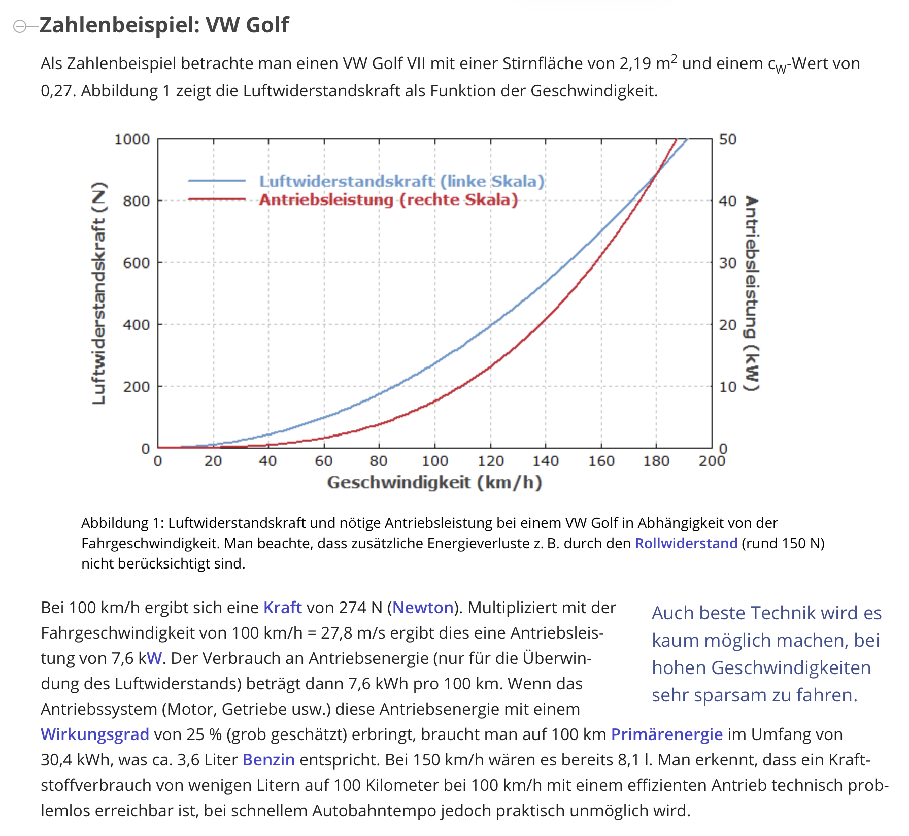 Simpel ausgedrückt: Durch den höheren Wirkungsgrad von EVs spielt der Luftwiderstand die größte Rolle beim Verbrauch und der steigt leider quadratisch zur Geschwindigkeit. Das betrifft Verbrenner genauso, nur, dass es dort nicht so extrem auffällt, da sehr viel Energie rein in Wärme verballert wird und wir uns an die l/100km Zahlen gewöhnt haben. Im Beispiel unten wird das noch mal schön illustriert.