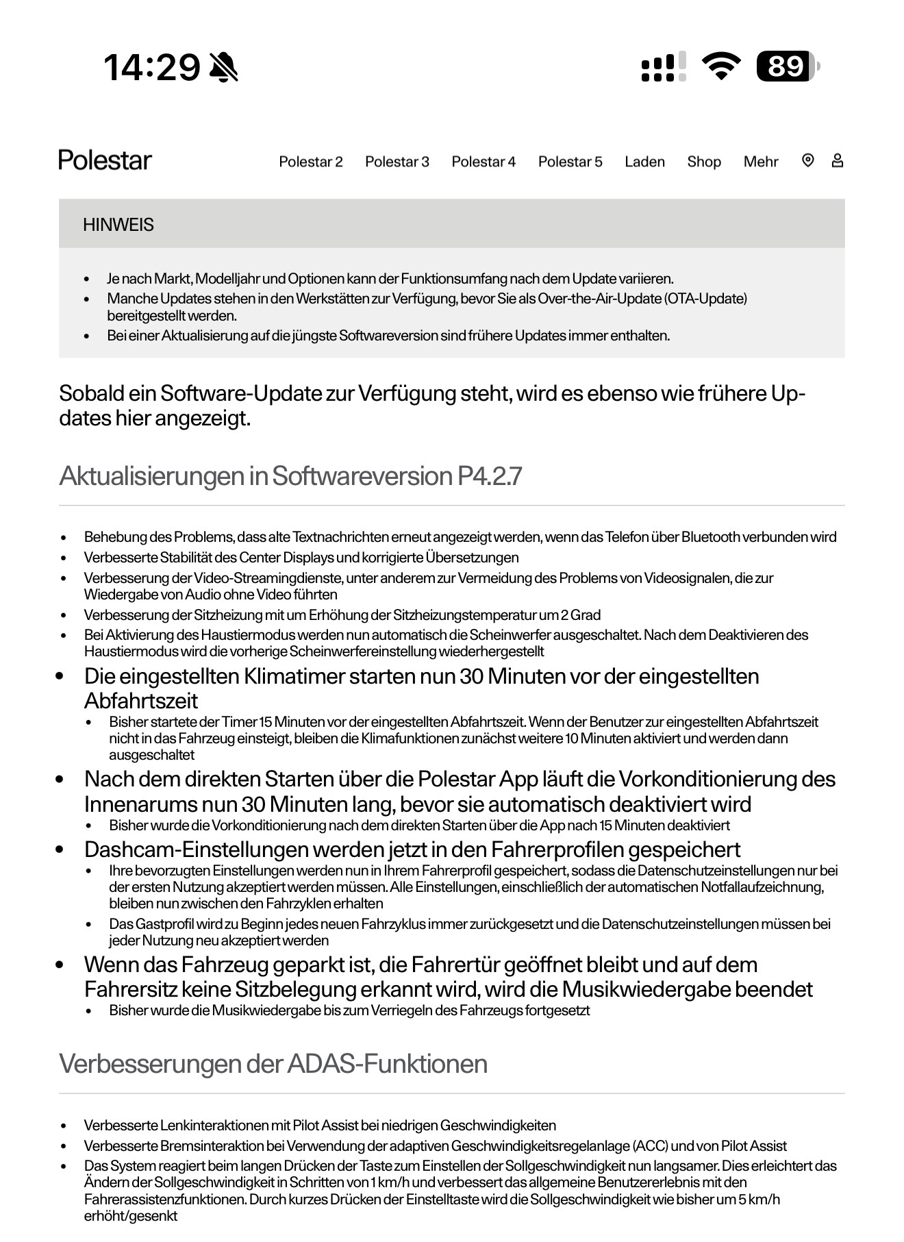 Ich schau schon ein wenig amüsiert auf manche Kommentare. Von Tesla kommend - eine Firma, die ja immer für alles mögliche gelobt wird was Software angeht - habe ich nun mit dem Polestar viel weniger bis keine Phantombremsungen mehr. Der Tesla fand ja jeden LKW auf der Nebenspur bedrohlich. Oder wenn ein Auto auf der Abbiegespur stand, um auf die Hauptstraße abzubiegen, machte der immer wieder mal Vollbremsungen. Das erlebe ich jetzt nicht mehr. Auch beschleunigt der Polestar wunderbar schnell nach einem Spurwechsel, der Tesla schien bei jedem Spurwechsel erst mal erheblich zu verlangsamen, um dann sehr laaaaaahm wieder zu beschleunigen. Da musste man erst mal zusätzlich beschleunigen, um nicht zum Verkehrshindernis zu werden.