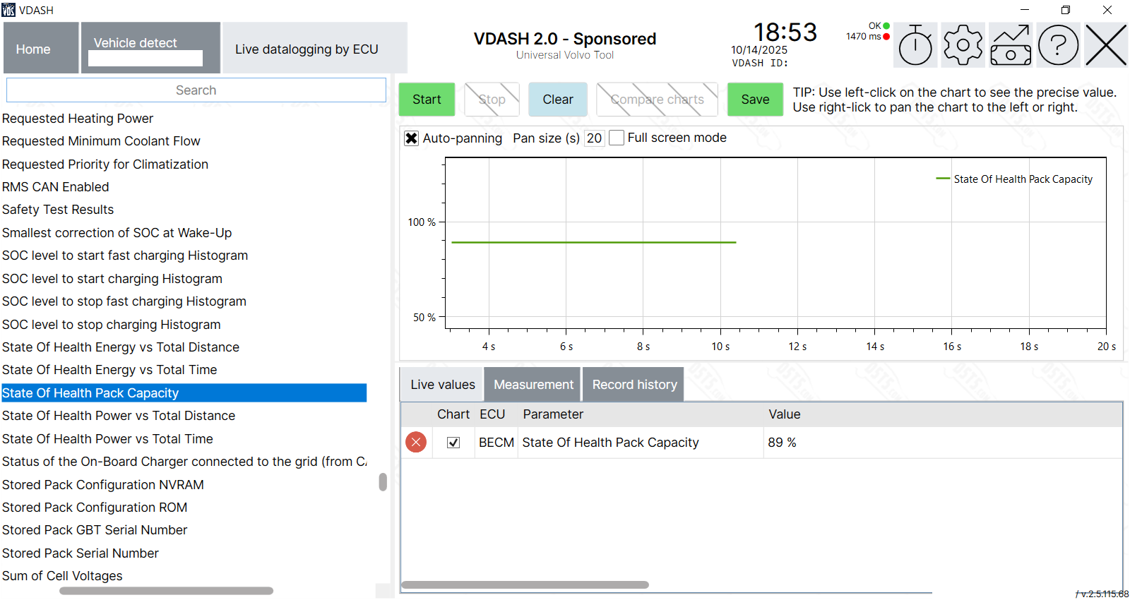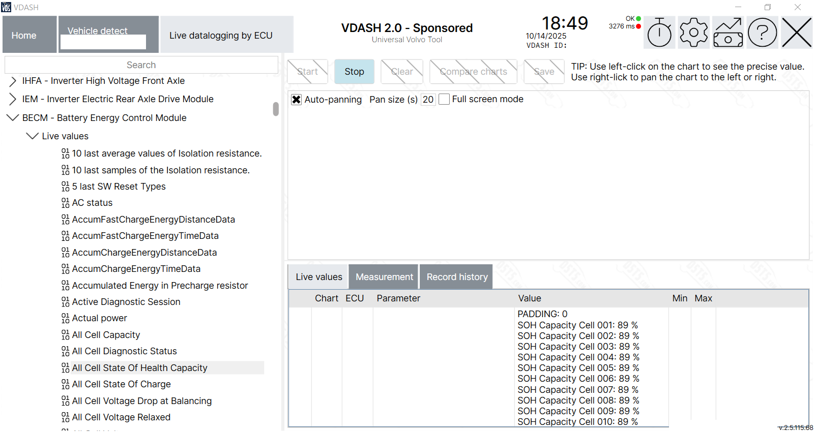 Die Werte, die wir abfragen wollen, müssen wir zur Abfrage markieren und doppelklicken. Diese landen dann rechts unten in der Liste. Damit die Abfrage beginnt, müssen wir oben auf „Start“ klicken. Bei so einem recht statischen Wert wie dem SOH können wir auch direkt wieder stoppen. Ein Log des immergleichen Werts ist kaum interessant. Bei anderen Werten bezüglich Temperatur oder tatsächlicher Leistungsentnahme könnte ein Log natürlich interessanter sein.