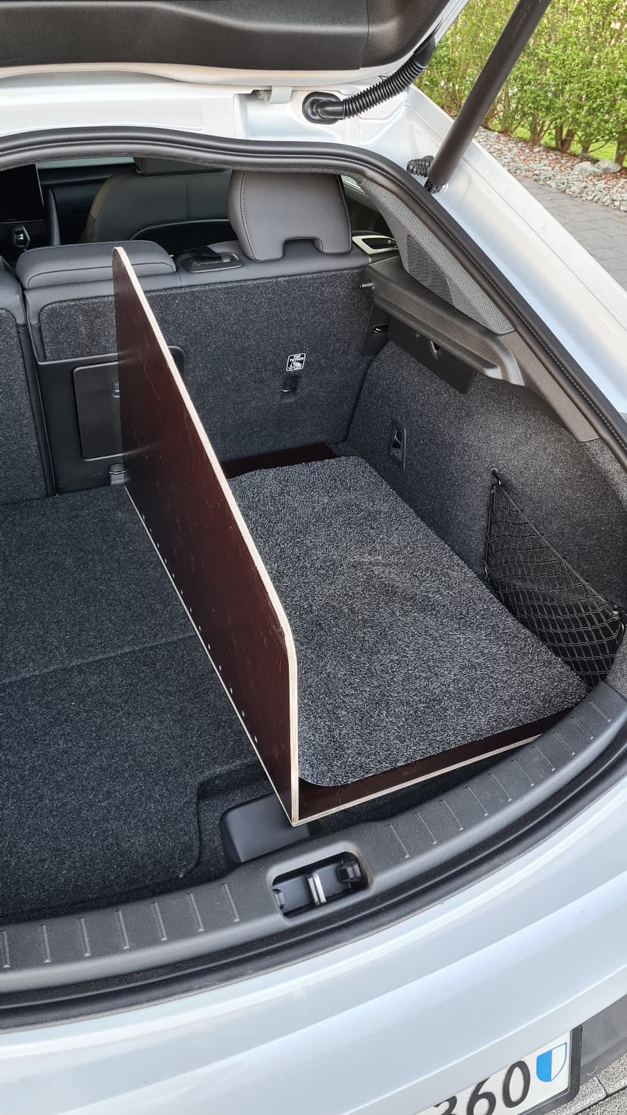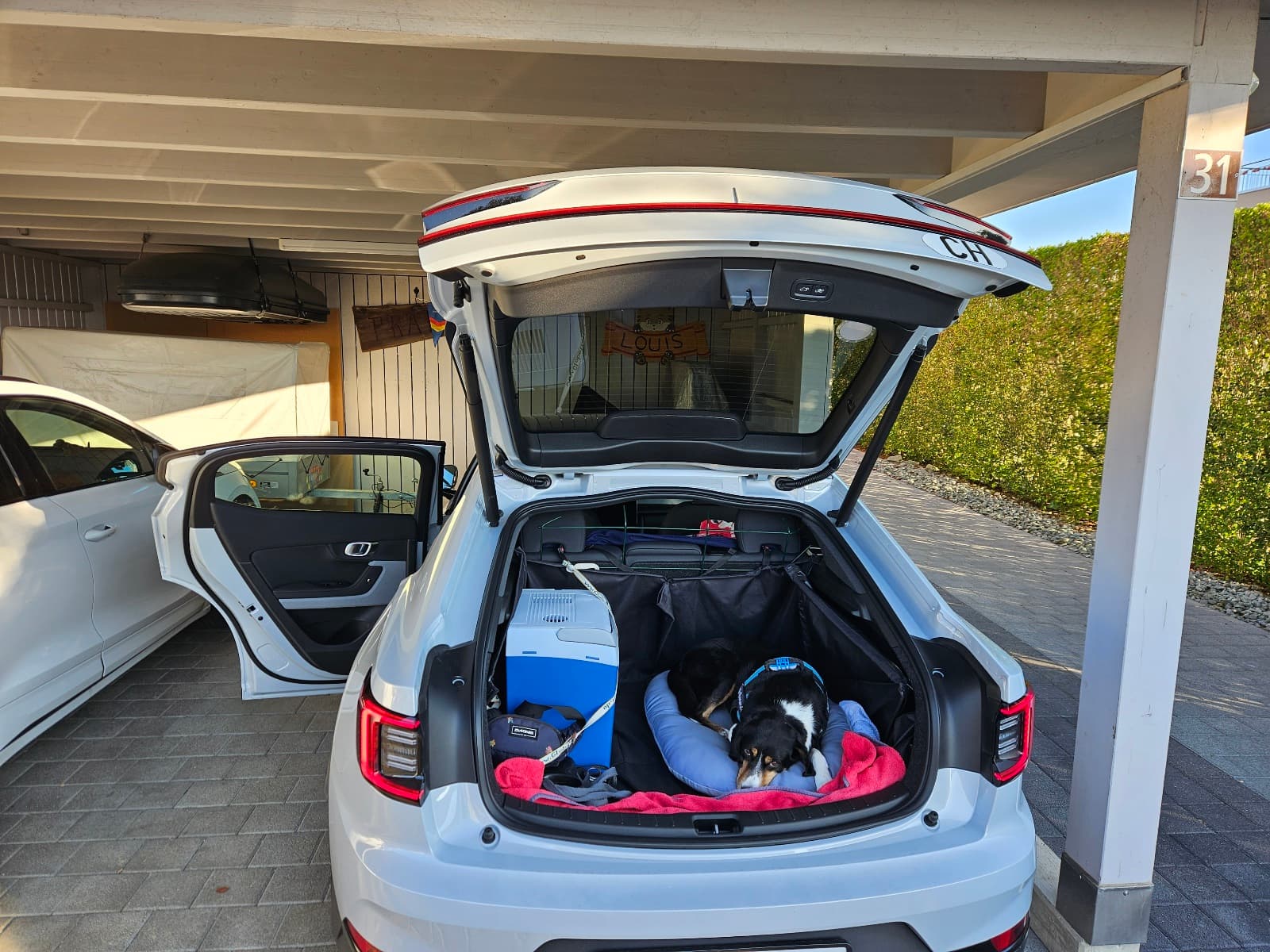 Unsere Dicke (40kg Labrador), hat den ganzen Kofferraum für sich. Früher war immer Rücksitze aber da alles Stoffbespannt ist im Polestar, musste Sie notgedrungen nach hinten weichen.