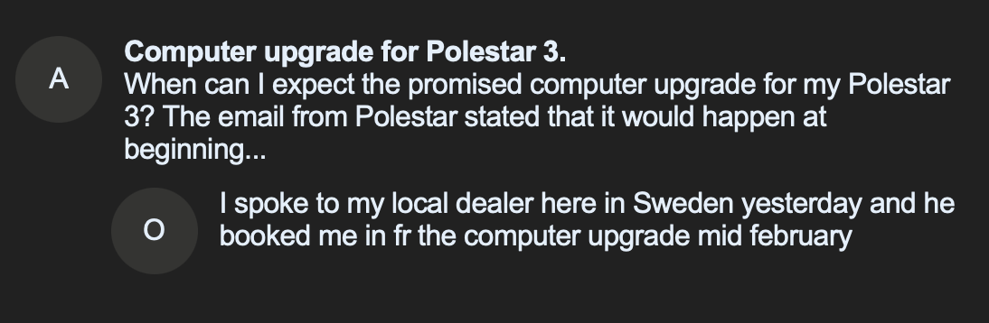 Somit geht es wohl bald los. Ich habe heute bei Polestar selbst nachgefragt, wann ich (in der CH) mit dem Upgrade rechnen kann. Ich halte euch auf dem Laufenden.