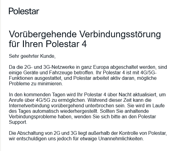 Derzeit werden europaweit die 2G- und 3G-Netze abgeschaltet, wodurch unter anderem Fahrzeuge kurzzeitig betroffen sind. Dein Polestar 4 ist mit der 4G-/5G-Technologie ausgestattet und wir arbeiten aktiv daran, mögliche Auswirkungen zu minimieren.