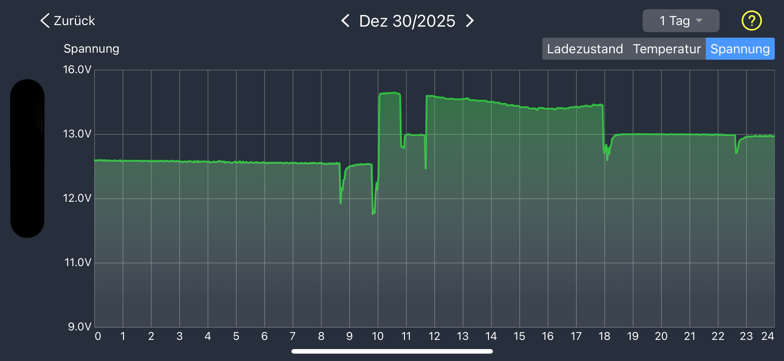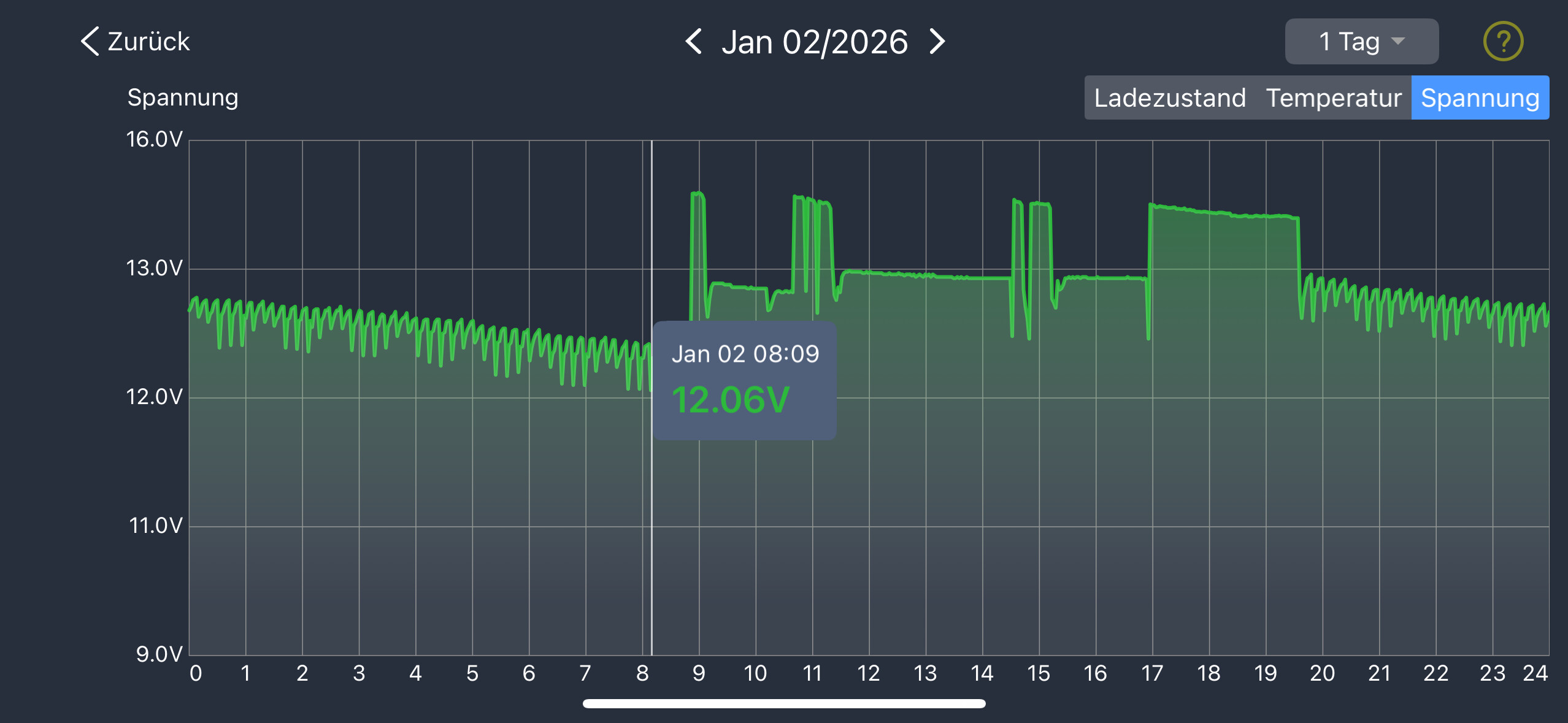 Das Lademanagement macht wilde Dinge, aufgrund der Kälte im Skigebiet ist die Kapazität und auch die Spannung recht deutlich zurückgegangen (12,5V @ Dez30 um 8 Uhr).