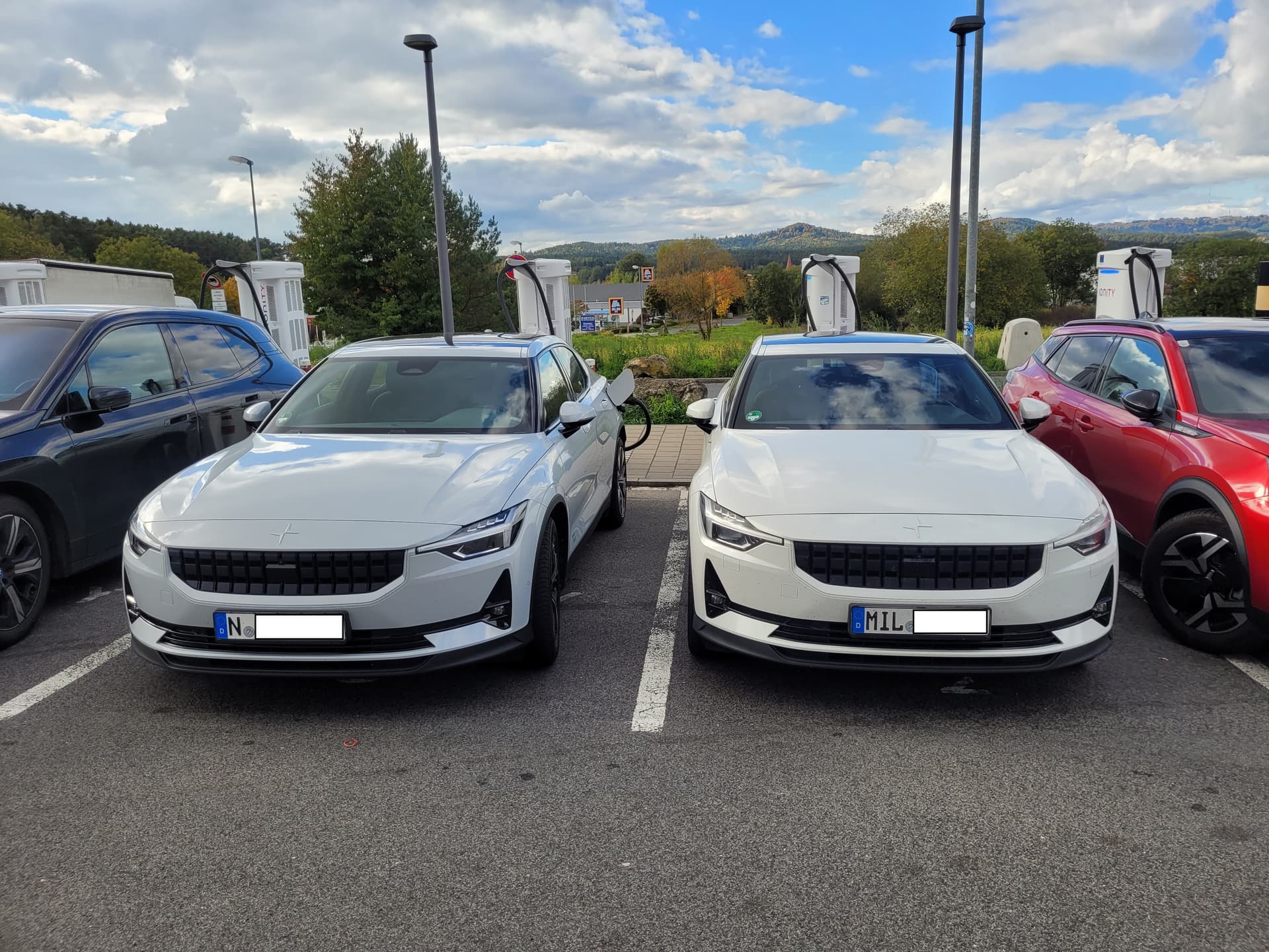 Der Bordeauxfarbene rechts stand schon so als ich kam und wollte wohl mit dem Ladeport (ebenfalls auf der Fahrerseite) optimal zum Ladekabelanschluss stehen, deshalb musste ich mich mehr oder weniger elegant aus dem Auto winden.